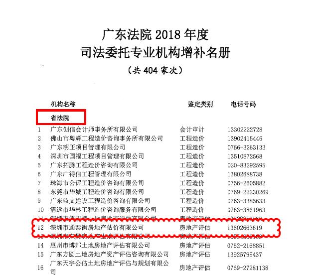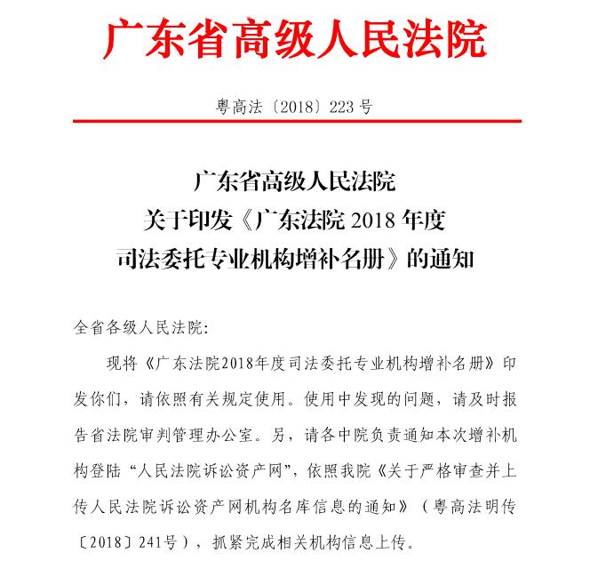 根據(jù)廣東省高級(jí)人民法院-粵高法[2018]223號(hào)文件,2018年9月10日我公司入選為《廣東法院2018年度司法委托專(zhuān)業(yè)機(jī)構(gòu)增補(bǔ)名冊(cè)》,這意味著我公司可以繼續(xù)執(zhí)業(yè)廣東省高級(jí)人民法院、中級(jí)人民法院關(guān)于房地產(chǎn)司法類(lèi)估價(jià)業(yè)務(wù),這為我公司業(yè)務(wù)的拓展提供了良好的平臺(tái)和機(jī)會(huì)。